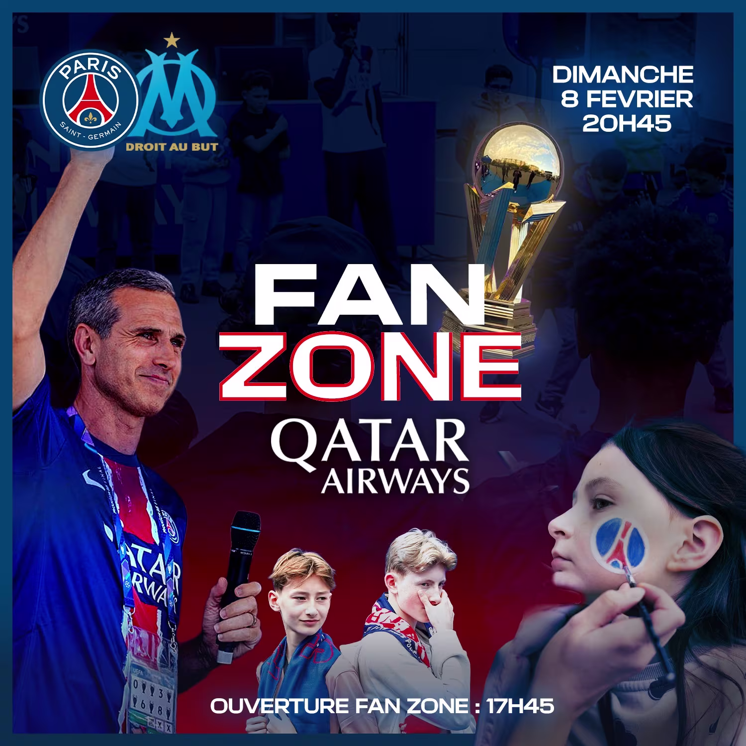 Le Paris Saint-Germain invite donc tous ses supporters à venir vivre un avant-match convivial et festif de 17h45 jusqu’à 30 minutes avant le coup d’envoi de la rencontre, un événement avec de nombreuses animations, des surprises, de la joie et un esprit festif, le tout dans un lieu si particulier : au pied du Parc des Princes. Alors, pour tous les détenteurs de billets en Tribune Paris, Borelli et Auteuil, rendez-vous sur la Fan Zone by Qatar Airways.