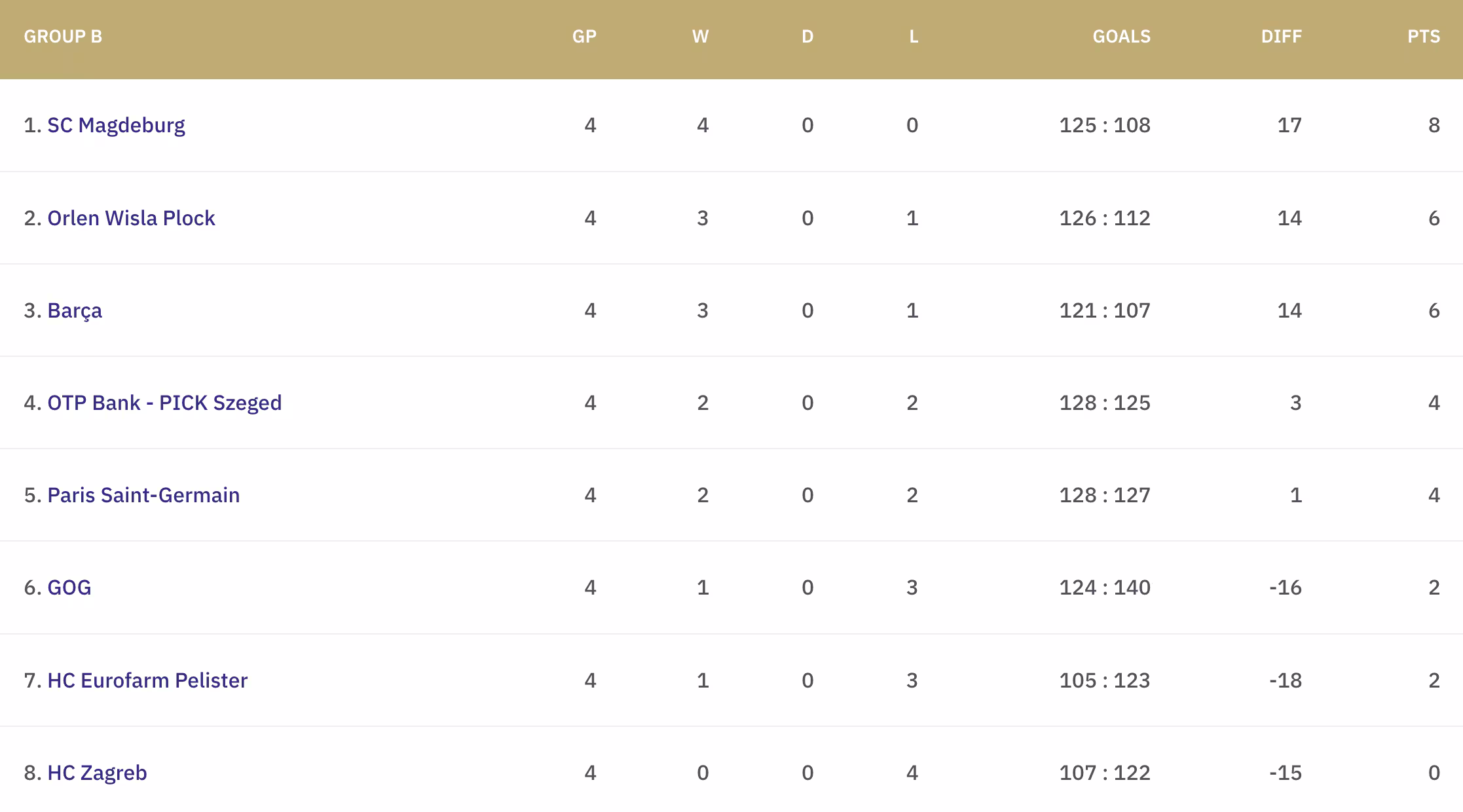 Magdebourg et Barcelone s’étant imposés, le duo de tête ne change pas dans ce groupe B. Szeged a cependant laissé sa troisième place à Plock, et voit nos Rouge et Bleu revenir à sa hauteur, tandis que GOG et Pelister restent à deux unités. Zagreb, qui n’a pas démérité à Coubertin hier, est toujours en quête de son premier point dans cette campagne.