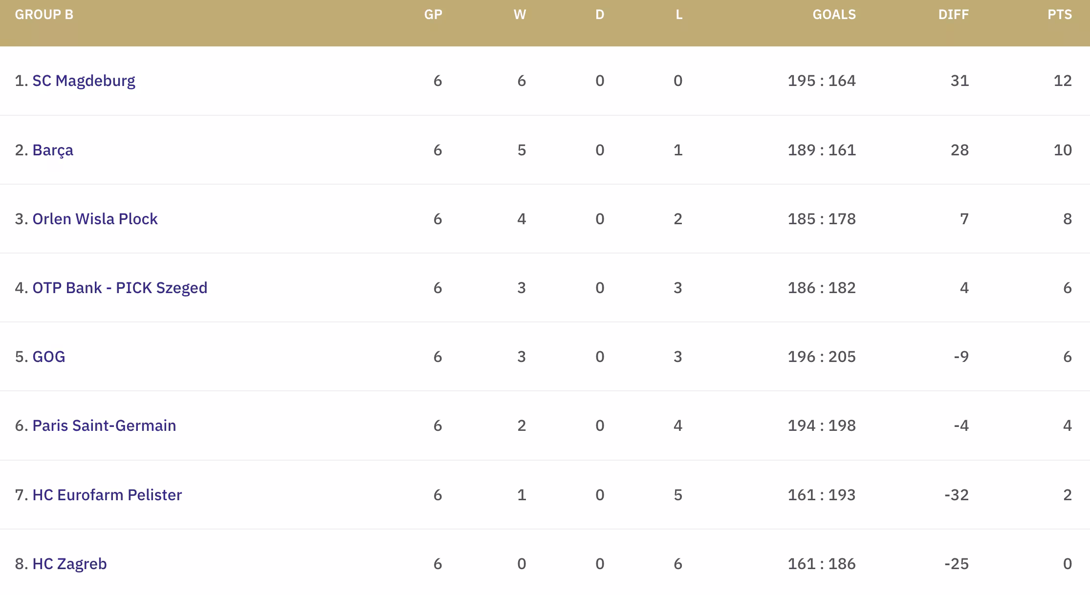 Au terme de cette sixième journée, seul un changement a eu lieu au sein du classement du groupe B : nos Parisiens ont laissé leur cinquième place à leur adversaire du soir, GOG. C’est sur le plan comptable que la situation est plus parlante. Avec ce sixième succès, Magdebourg fait le plein avec 12 points au compteur, soit deux de plus sur Barcelone. Tandis que Plock, troisième, voit Szeged et GOG revenir à deux longueurs avant de se déplacer en Catalogne lors de la prochaine journée, Paris se situe désormais à la dernière place qualificative pour les barrages, avec quatre unités. Enfin, Pelister (2 points) et Zagreb (0) clôturent le classement de ce groupe B.
