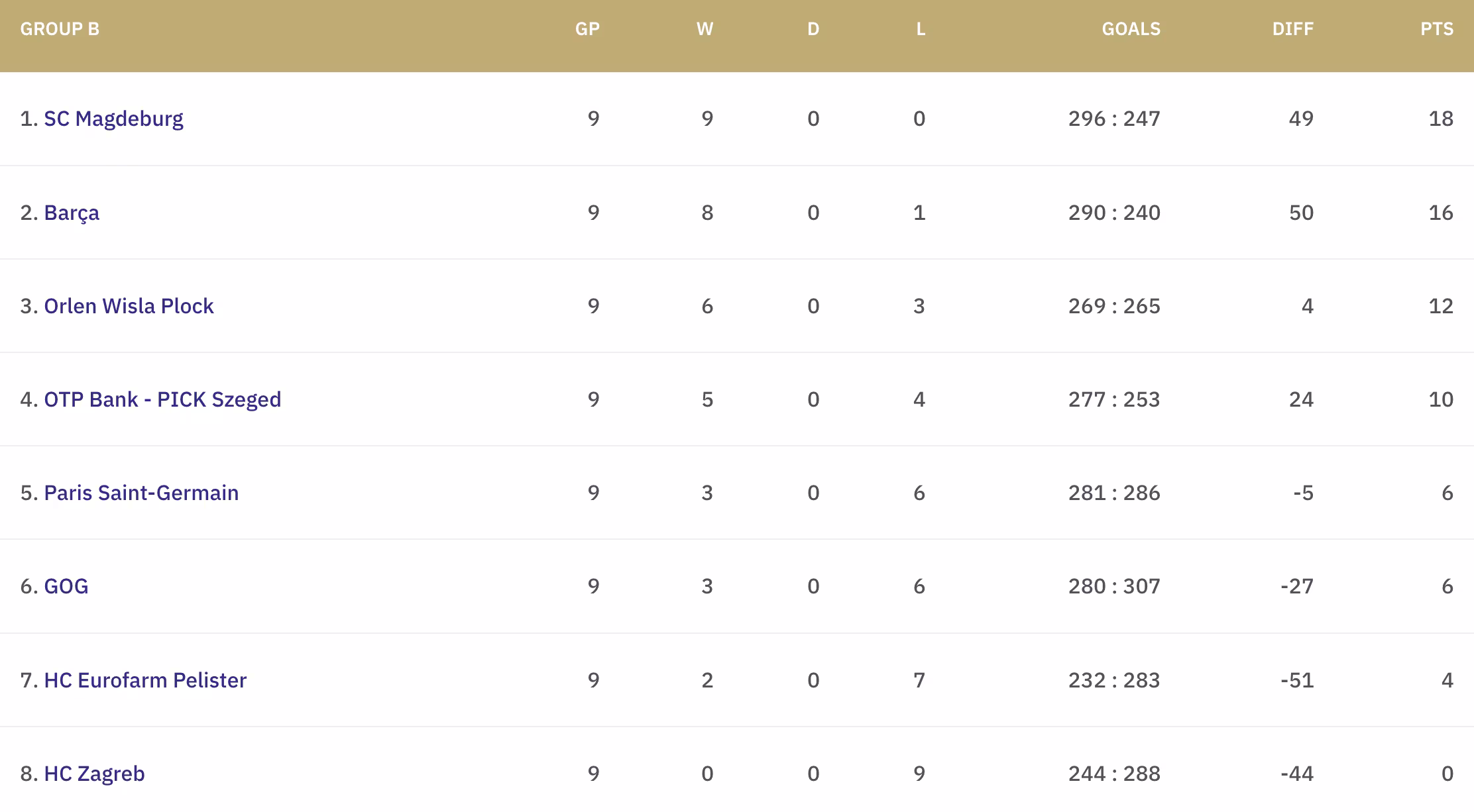 Aucun changement au classement de ce groupe B cette semaine. C'est davantage sur le plan comptable que l'écart commence à se créer entre le top 4 et le reste. Grâce à son succès face à nos Rouge et Bleu, Plock conserve sa troisième place et possède désormais six longueurs d'avance sur Paris et GOG, respectivement cinquième et sixième. Szeged compte de son côté quatre unités de plus que les hommes de Stefan Madsen, apportant un petit matelas d'avance, tandis que derrière, Pelister reste en embuscade avec quatre points, soit deux de moins que ses plus proches poursuivants. Battu pour la neuvième fois en autant de rencontres, Zagreb semble d'ores et déjà avoir dit adieu aux espoirs d'une qualification pour les barrages.