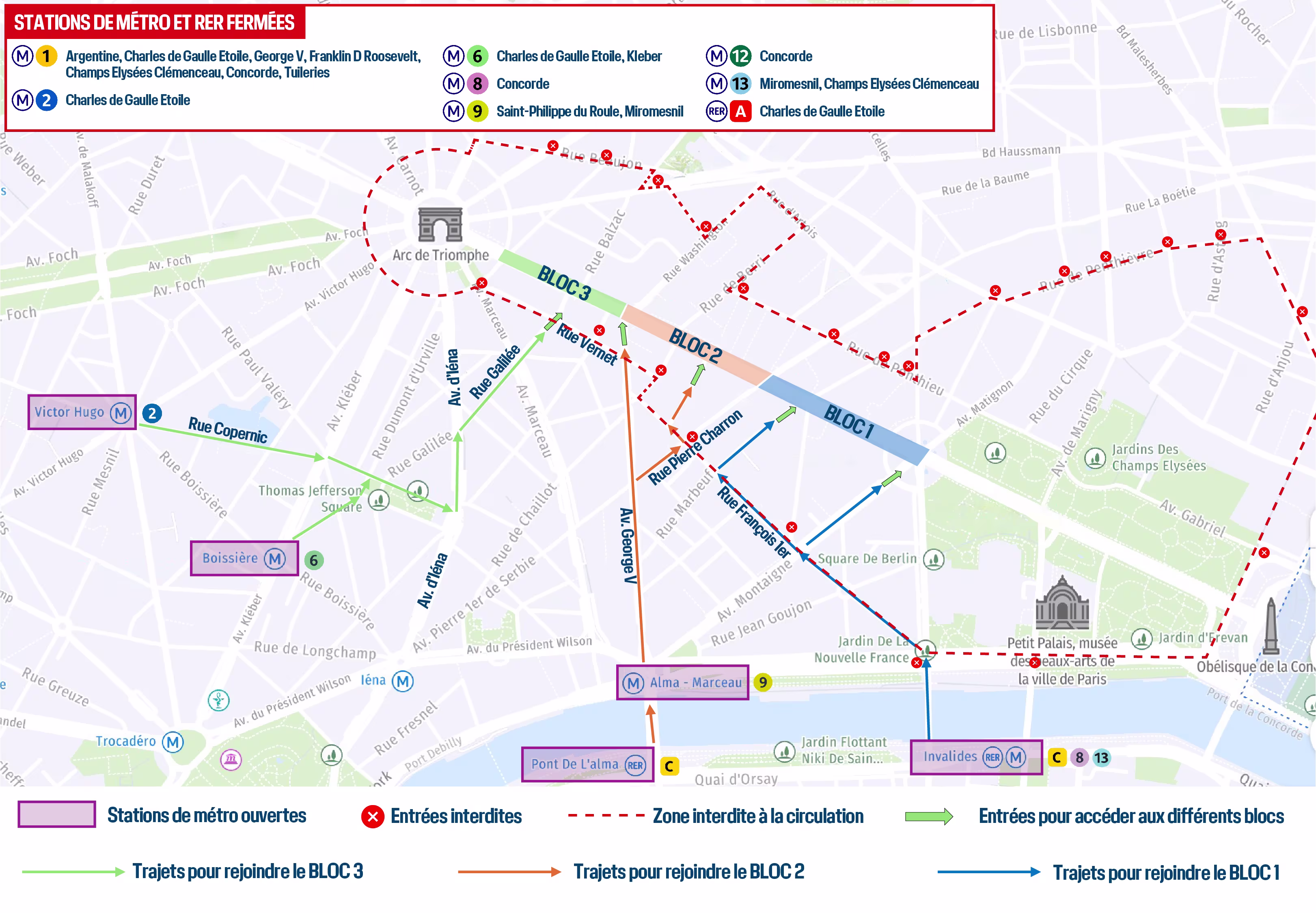 La zone de célébration, dont vous trouverez le plan ci-dessous, sera divisée en 3 blocs accessibles par la zone SUD uniquement (tous les accès par le Nord seront bloqués par les autorités) en empruntant les stations suivantes :