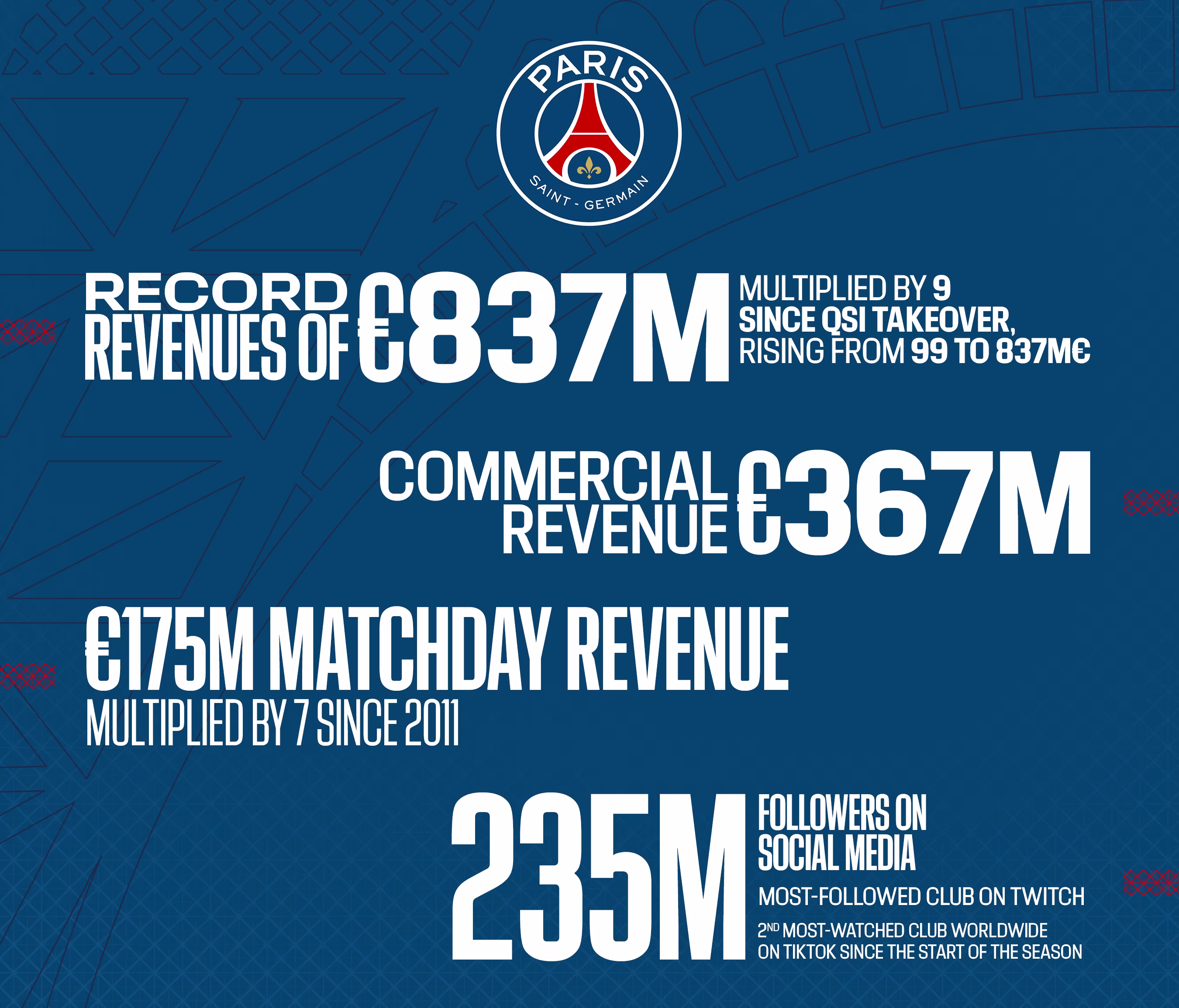 Le Paris Saint-Germain clôt l’exercice 2024-2025 sur un chiffre d’affaires record de 837 millions d’euros. Cette performance illustre la maturité du projet initié depuis l’arrivée de son actionnaire principal QSI et confirme la solidité du modèle économique du Club parmi les plus performants au niveau mondial.