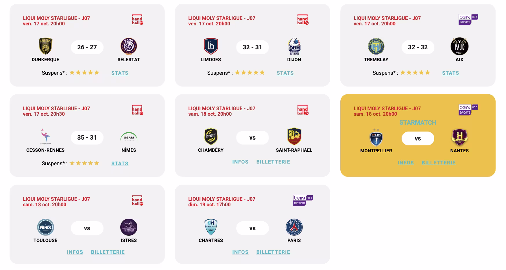 Autre victoire surprise, celle de Cesson-Rennes à domicile face à Nîmes (35-31). Ce sont notamment les 13 réalisations de Xavier Labigang qui ont montré la voie à des Bretons qui confirment ainsi leur bon début de saison, avec une seule défaite (face à Montpellier) lors des six dernières journées. Mené une grande partie de la rencontre, Tremblay a su accrocher le nul face à Aix pour rester dans le top 5 (32-32). Enfin, Limoges s’est fait peur face à Dijon, mais est parvenu à signer une troisième victoire de rang pour revenir provisoirement à hauteur de Nantes.