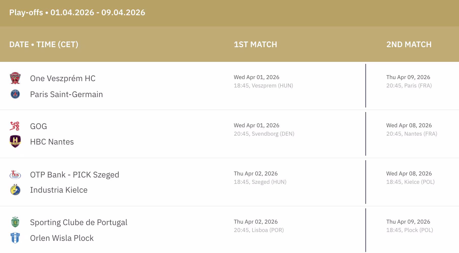 The capital club will kick off the first leg of the Champions League play-offs on Wednesday evening. A few hours later, it will be Nantes' turn to try and take an option on quarter-final qualification by getting a good result against GOG in Denmark. On Thursday, Szeged will be looking to do the same in front of their home crowd against Kielce, third in Group A. Finally, the last clash of the play-offs pits Sporting CP against Wisla Plock in what promises to be a thrilling encounter.