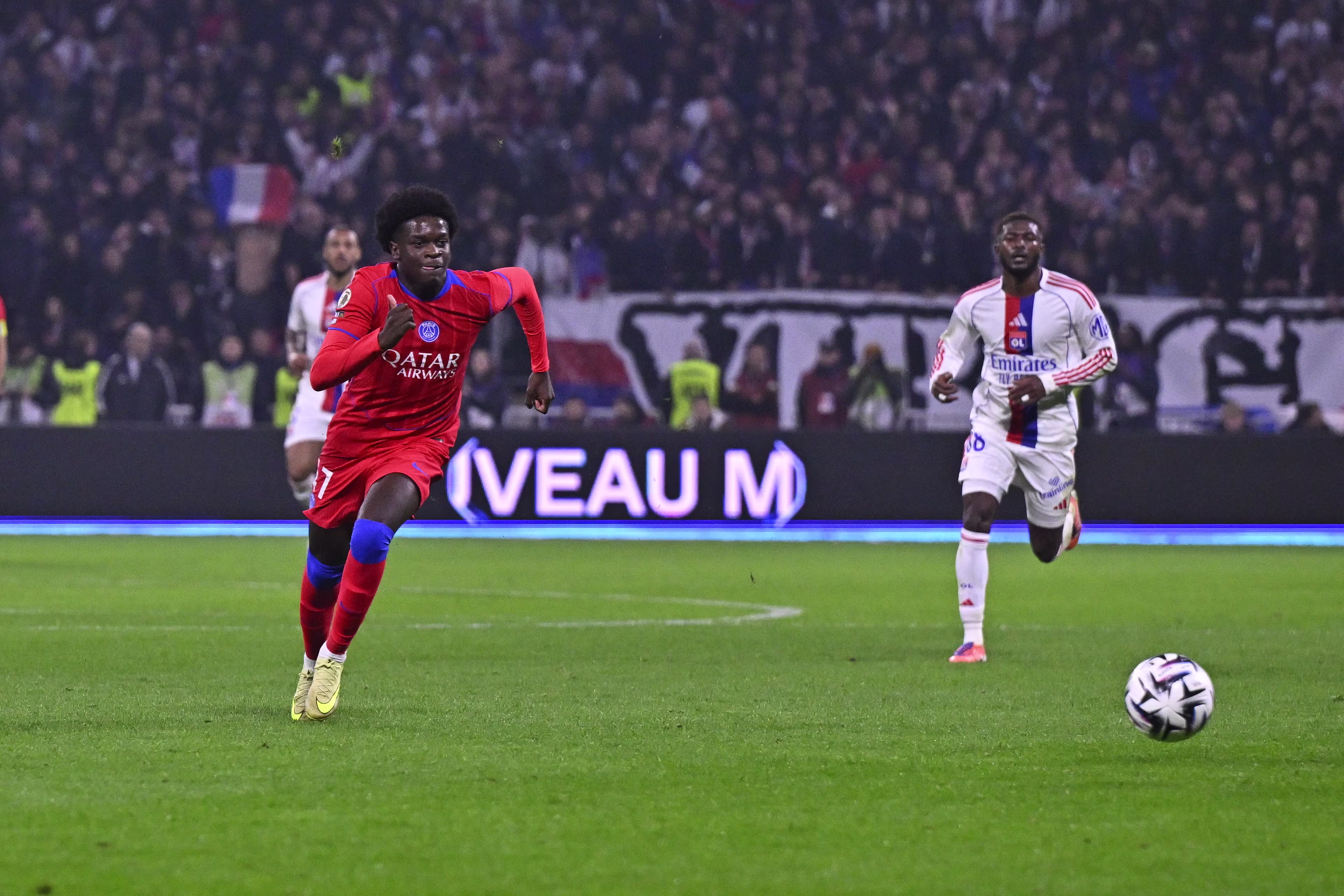 C’est la pause au Groupama Stadium de Décines-Charpieu, où le Paris Saint-Germain mène 1-2 face à l'Olympique Lyonnais grâce à des buts de Zaïre-Emery (26e) et Kvaratskhelia (33e) et malgré l'égalisation de Moreira (30e). On se retrouve dans 15 minutes !